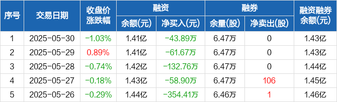 融资方面,当日融资买入178.94万元,融资偿还222.83万元,融资净偿还43.89万元,连续7日净偿还累计917.29万元。融券方面,融券卖出0股,融券偿还0股,融券余量6.47万股,融券余额174.09万元。融资融券余额合计1.43亿元。