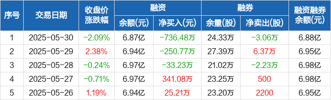 融资方面,当日融资买入1231.39万元,融资偿还1967.88万元,融资净偿还736.48万元,连续3日净偿还累计1020.49万元。融券方面,融券卖出1.21万股,融券偿还4.27万股,融券余量24.33万股,融券余额102.43万元。融资融券余额合计6.88亿元。