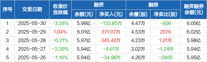 融资方面,当日融资买入857.45万元,融资偿还991.3万元,融资净偿还133.85万元。融券方面,融券卖出400股,融券偿还1000股,融券余量4.47万股,融券余额105.02万元。融资融券余额合计6亿元。