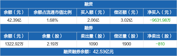 融资方面,当日融资买入2.06亿元,融资偿还3.02亿元,融资净偿还9631.98万元,净偿还额两市排名第十。融券方面,融券卖出1090股,融券偿还1900股,融券余量2.19万股,融券余额1322.92万元。融资融券余额合计42.53亿元。