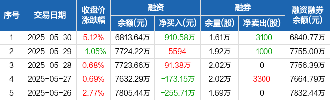 融资方面,当日融资买入1201.81万元,融资偿还2112.4万元,融资净偿还910.58万元。融券方面,融券卖出100股,融券偿还3200股,融券余量1.61万股,融券余额27.13万元。融资融券余额合计6840.77万元。