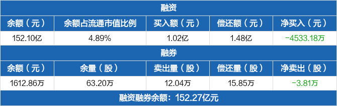 融资方面,当日融资买入1.02亿元,融资偿还1.48亿元,融资净偿还4533.18万元。融券方面,融券卖出12.04万股,融券偿还15.85万股,融券余量63.2万股,融券余额1612.86万元。融资融券余额合计152.27亿元。