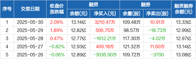 融资方面,当日融资买入1.02亿元,融资偿还6970.11万元,融资净买入3210.47万元。融券方面,融券卖出12.37万股,融券偿还1.46万股,融券余量109.48万股,融券余额1929.04万元。融资融券余额合计13.33亿元。
