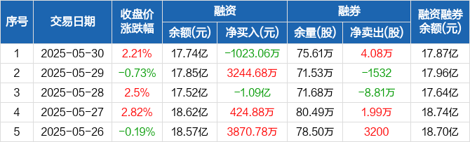 杭州银行融资融券信息显示,2025年5月30日融资净偿还1023.06万元;融资余额17.74亿元,较前一日下降0.57%。