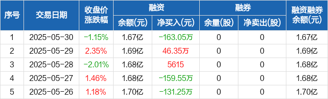 融资方面,当日融资买入330.76万元,融资偿还493.81万元,融资净偿还163.05万元。融券方面,融券卖出0股,融券偿还0股,融券余量0股,融券余额0元。融资融券余额合计1.67亿元。