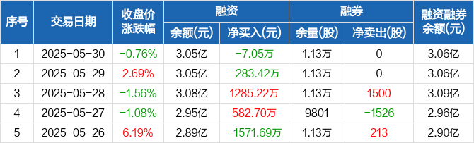 融资方面,当日融资买入1371.35万元,融资偿还1378.4万元,融资净偿还7.05万元。融券方面,融券卖出0股,融券偿还0股,融券余量1.13万股,融券余额76.94万元。融资融券余额合计3.06亿元。