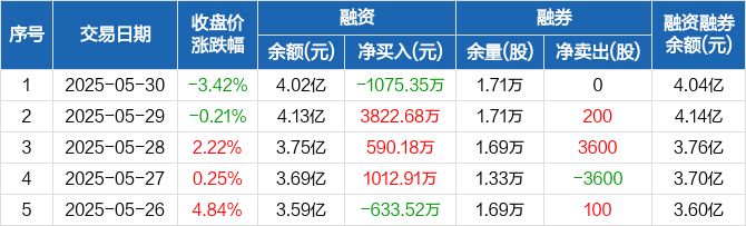 融资方面,当日融资买入3134.88万元,融资偿还4210.23万元,融资净偿还1075.35万元。融券方面,融券卖出0股,融券偿还0股,融券余量1.71万股,融券余额117.28万元。融资融券余额合计4.04亿元。