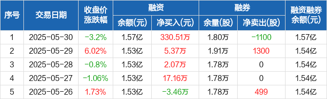 融资方面,当日融资买入1196.91万元,融资偿还866.39万元,融资净买入330.51万元,连续4日净买入累计355.11万元。融券方面,融券卖出400股,融券偿还1500股,融券余量1.8万股,融券余额47.94万元。融资融券余额合计1.57亿元。