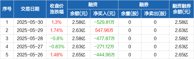 成都华微融资融券信息显示,2025年5月30日融资净偿还529.81万元;融资余额2.58亿元,较前一日下降2.01%。