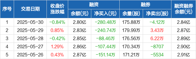 融资方面,当日融资买入395.84万元,融资偿还676.32万元,融资净偿还280.48万元,连续5日净偿还累计868.26万元。融券方面,融券卖出2.3万股,融券偿还6.42万股,融券余量175.88万股,融券余额413.31万元。融资融券余额合计2.84亿元。