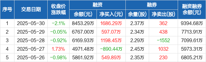 融资方面,当日融资买入3463.11万元,融资偿还1776.82万元,融资净买入1686.29万元,连续3日净买入累计3481.8万元。融券方面,融券卖出1800股,融券偿还1438股,融券余量2.37万股,融券余额941.39万元。融资融券余额合计9394.68万元。