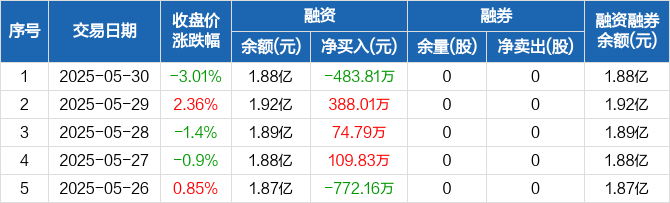 芯海科技融资融券信息显示,2025年5月30日融资净偿还483.81万元;融资余额1.88亿元,较前一日下降2.51%。