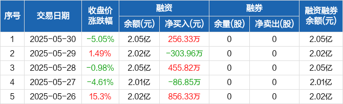 融资方面,当日融资买入1270.58万元,融资偿还1014.25万元,融资净买入256.33万元。融券方面,融券卖出0股,融券偿还0股,融券余量0股,融券余额0元。融资融券余额合计2.05亿元。