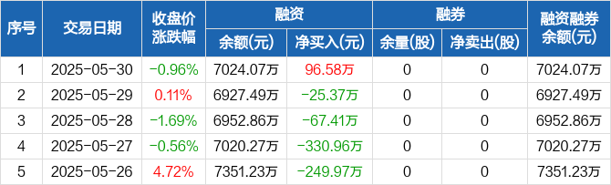 融资方面,当日融资买入308.3万元,融资偿还211.73万元,融资净买入96.58万元。融券方面,融券卖出0股,融券偿还0股,融券余量0股,融券余额0元。融资融券余额合计7024.07万元。