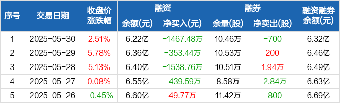 融资方面,当日融资买入6513.42万元,融资偿还7980.9万元,融资净偿还1467.48万元,连续4日净偿还累计3799.27万元。融券方面,融券卖出200股,融券偿还900股,融券余量10.46万股,融券余额1025.34万元。融资融券余额合计6.32亿元。