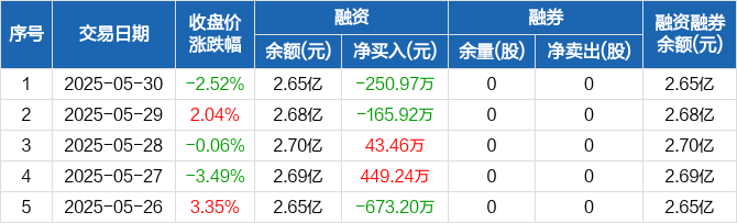 融资方面,当日融资买入1717.4万元,融资偿还1968.38万元,融资净偿还250.97万元。融券方面,融券卖出0股,融券偿还0股,融券余量0股,融券余额0元。融资融券余额合计2.65亿元。