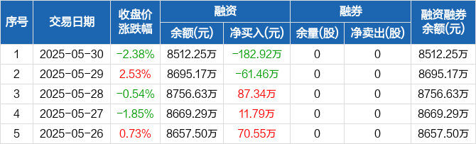 融资方面,当日融资买入203.76万元,融资偿还386.67万元,融资净偿还182.92万元。融券方面,融券卖出0股,融券偿还0股,融券余量0股,融券余额0元。融资融券余额合计8512.25万元。