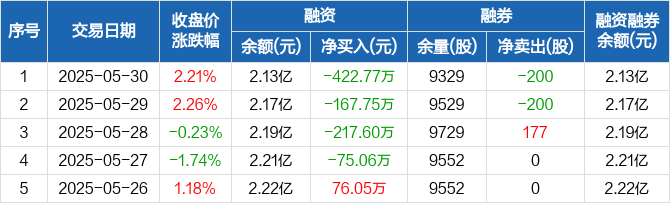 融资方面,当日融资买入1314.25万元,融资偿还1737.01万元,融资净偿还422.77万元,连续4日净偿还累计883.18万元。融券方面,融券卖出0股,融券偿还200股,融券余量9329股,融券余额38.43万元。融资融券余额合计2.13亿元。