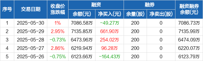 融资方面,当日融资买入486.64万元,融资偿还535.91万元,融资净偿还49.27万元。融券方面,融券卖出0股,融券偿还0股,融券余量200股,融券余额1412元。融资融券余额合计7086.73万元。