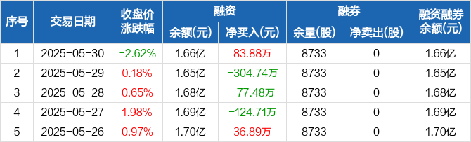 融资方面,当日融资买入309.17万元,融资偿还225.29万元,融资净买入83.88万元。融券方面,融券卖出0股,融券偿还0股,融券余量8733股,融券余额14.6万元。融资融券余额合计1.66亿元。