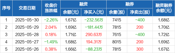 融资方面,当日融资买入657.28万元,融资偿还889.84万元,融资净偿还232.56万元。融券方面,融券卖出0股,融券偿还400股,融券余量7415股,融券余额68.21万元。融资融券余额合计1.68亿元。