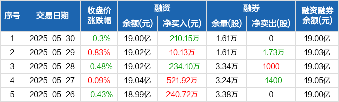 融资方面,当日融资买入1334.49万元,融资偿还1544.64万元,融资净偿还210.15万元。融券方面,融券卖出0股,融券偿还0股,融券余量1.61万股,融券余额37万元。融资融券余额合计19亿元。