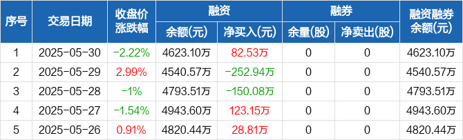 融资方面,当日融资买入344.41万元,融资偿还261.88万元,融资净买入82.53万元。融券方面,融券卖出0股,融券偿还0股,融券余量0股,融券余额0元。融资融券余额合计4623.1万元。