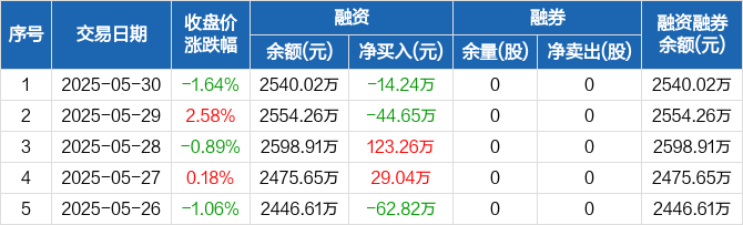 融资方面,当日融资买入107.8万元,融资偿还122.04万元,融资净偿还14.24万元。融券方面,融券卖出0股,融券偿还0股,融券余量0股,融券余额0元。融资融券余额合计2540.02万元。