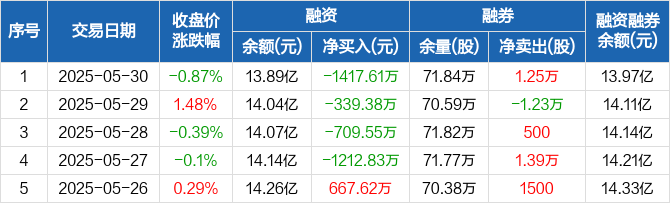 融资方面,当日融资买入1631.23万元,融资偿还3048.84万元,融资净偿还1417.61万元,连续4日净偿还累计3679.38万元。融券方面,融券卖出1.41万股,融券偿还1600股,融券余量71.84万股,融券余额734.2万元。融资融券余额合计13.97亿元。