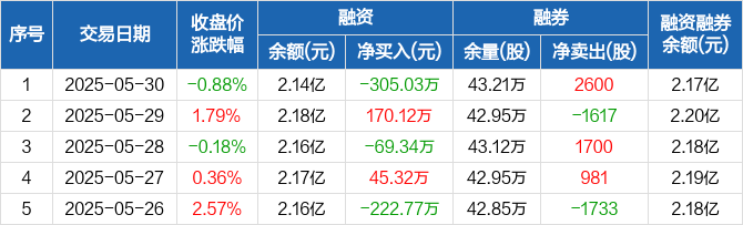 融资方面,当日融资买入312.25万元,融资偿还617.28万元,融资净偿还305.03万元。融券方面,融券卖出2600股,融券偿还0股,融券余量43.21万股,融券余额244.16万元。融资融券余额合计2.17亿元。