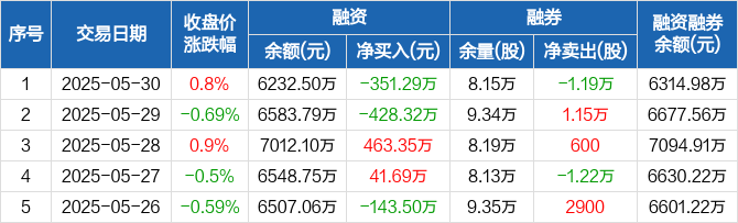 融资方面,当日融资买入443.35万元,融资偿还794.64万元,融资净偿还351.29万元。融券方面,融券卖出0股,融券偿还1.19万股,融券余量8.15万股,融券余额82.48万元。融资融券余额合计6314.98万元。