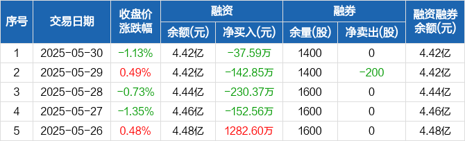 融资方面,当日融资买入1554.26万元,融资偿还1591.85万元,融资净偿还37.59万元,连续4日净偿还累计563.37万元。融券方面,融券卖出0股,融券偿还0股,融券余量1400股,融券余额1.71万元。融资融券余额合计4.42亿元。