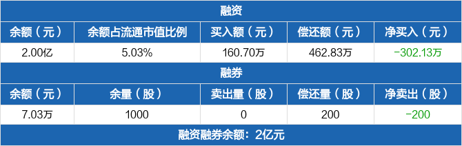 融资方面,当日融资买入160.7万元,融资偿还462.83万元,融资净偿还302.13万元,连续3日净偿还累计673.76万元。融券方面,融券卖出0股,融券偿还200股,融券余量1000股,融券余额7.03万元。融资融券余额合计2亿元。