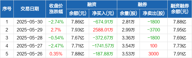 融资方面,当日融资买入5754.04万元,融资偿还6428.95万元,融资净偿还674.91万元。融券方面,融券卖出2100股,融券偿还3900股,融券余量2.81万股,融券余额186.33万元。融资融券余额合计7.88亿元。