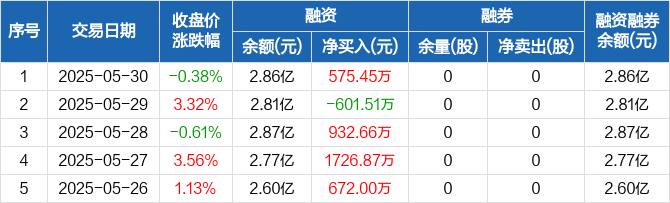 融资方面,当日融资买入3124.41万元,融资偿还2548.96万元,融资净买入575.45万元。融券方面,融券卖出0股,融券偿还0股,融券余量0股,融券余额0元。融资融券余额合计2.86亿元。