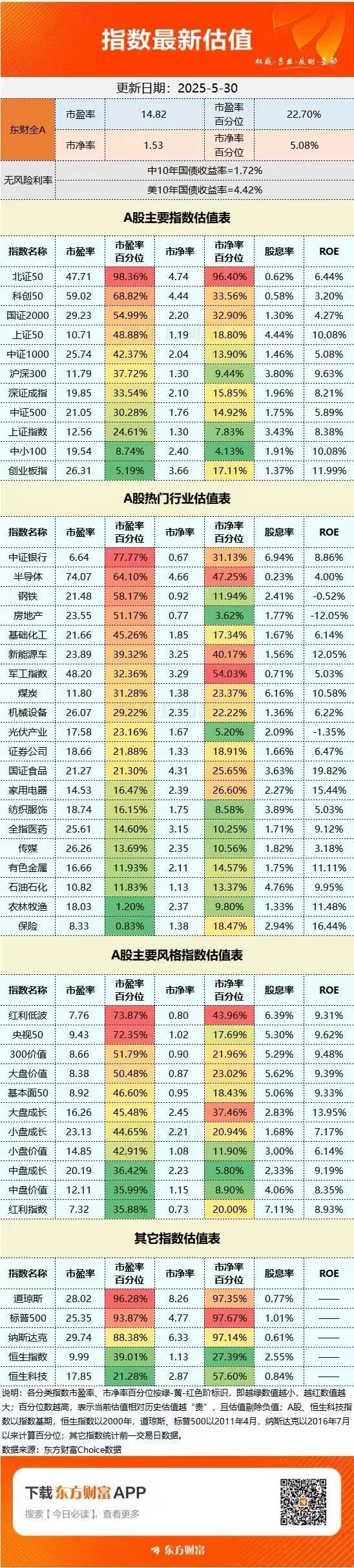 截至5月30日收盘,东方财富Choice数据显示,东财全A市盈率为14.82倍,市盈率百分位为22.7%;市净率为1.53倍,市净率百分位为5.08%。