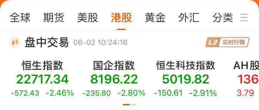 亚洲股市开盘走弱,港股低开低走,恒生科技指数跌近3%,恒生指数跌2.46%。