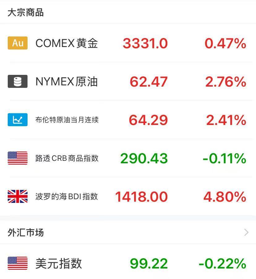 纽约黄金上涨0.47%至每盎司3331美元。因地缘政治紧张局势,布伦特原油、WTI原油双双飙升超2%。