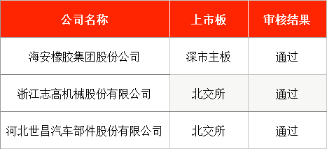 其中,拟在深交所IPO的海安橡胶集团股份公司(下称“海安橡胶”),以及拟在北交所IPO的浙江志高机械股份有限公司(下称“志高机械”)、河北世昌汽车部件股份有限公司(下称“世昌股份”)均成功过会。