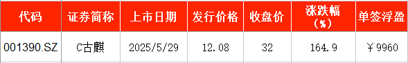 5月29日,古麒绒材在深圳证券交易所(下称“深交所”)主板正式挂牌上市,发行价为12.08元/股,截至上市首日收盘,该股报32元/股,涨幅为164.9%。以收盘价计算,投资者中一签浮盈为9960元。