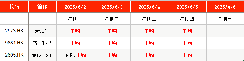 Wind数据显示,新琪安(02573.HK)、容大科技(09881.HK)、METALIGHT(02605.HK)均将于本周二至周四(6月3日至6月5日)继续申购。
