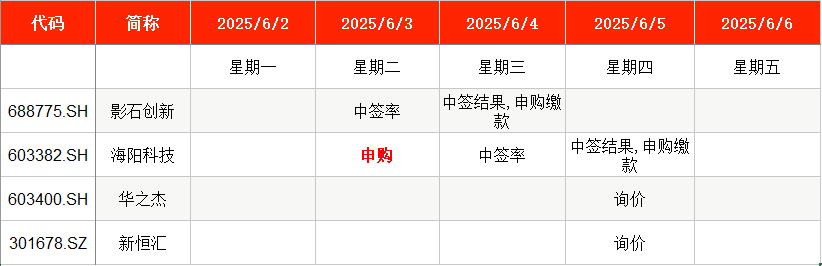 澎湃新闻根据Wind及公开信息梳理统计,本周(6月3日至6月6日),有1只新股安排申购,为海阳科技股份有限公司(下称“海阳科技”,603382)。