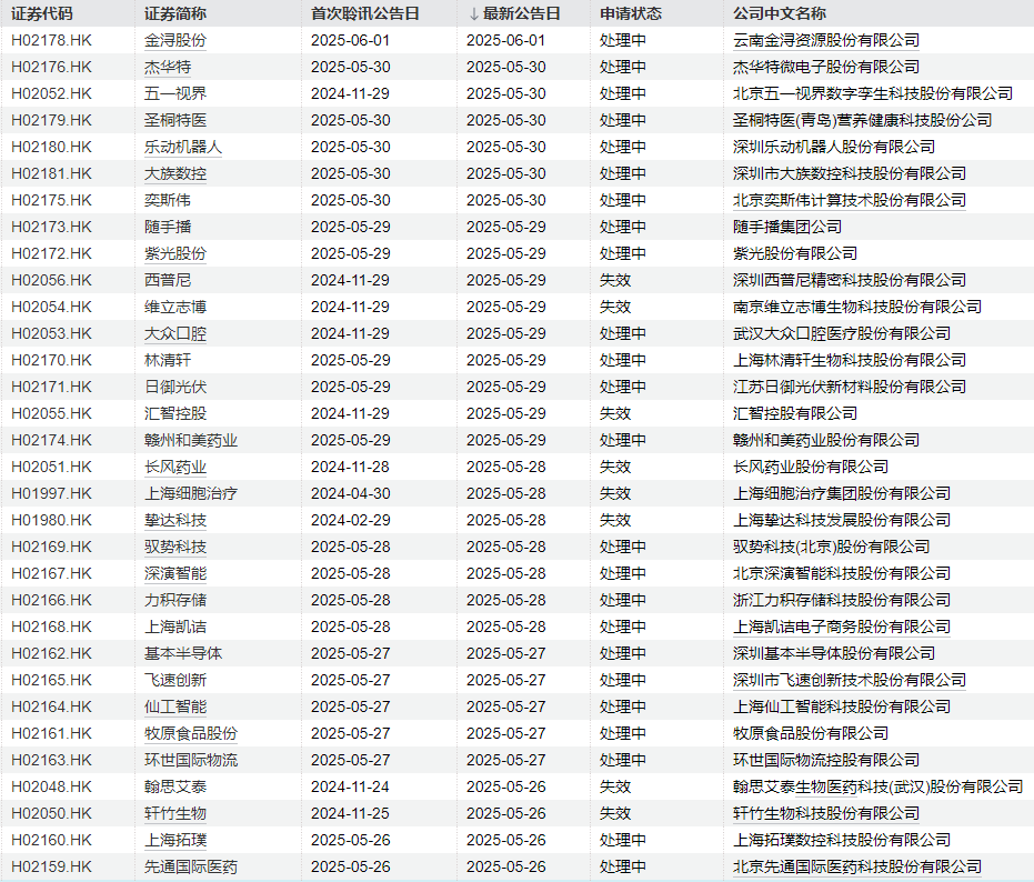 其中,云南金浔资源股份有限公司、杰华特微电子股份有限公司、圣桐特医(青岛)营养健康科技股份公司、深圳乐动机器人股份有限公司、深圳市大族数控科技股份有限公司、北京奕斯伟计算技术股份有限公司、随手播集团公司、紫光股份有限公司、上海林清轩生物科技股份有限公司、江苏日御光伏新材料股份有限公司、赣州和美药业股份有限公司、驭势科技(北京)股份有限公司、北京深演智能科技股份有限公司、浙江力积存储科技股份有限公司、上海凯诘电子商务股份有限公司、深圳基本半导体股份有限公司、深圳市飞速创新技术股份有限公司、上海仙工智能科技股份有限公司、牧原食品股份有限公司、环世国际物流控股有限公司、上海拓璞数控科技股份有限公司、北京先通国际医药科技股份有限公司等22家公司为首次递交。