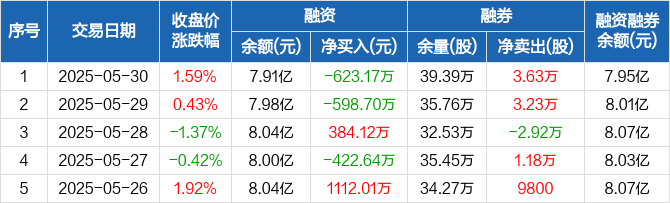 融资方面,当日融资买入4145.84万元,融资偿还4769.01万元,融资净偿还623.17万元。融券方面,融券卖出3.95万股,融券偿还3200股,融券余量39.39万股,融券余额377.36万元。融资融券余额合计7.95亿元。