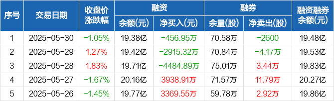 融资方面,当日融资买入2826.48万元,融资偿还3283.42万元,融资净偿还456.95万元,连续3日净偿还累计7857.15万元。融券方面,融券卖出1.95万股,融券偿还2.21万股,融券余量70.58万股,融券余额1061.52万元。融资融券余额合计19.48亿元。