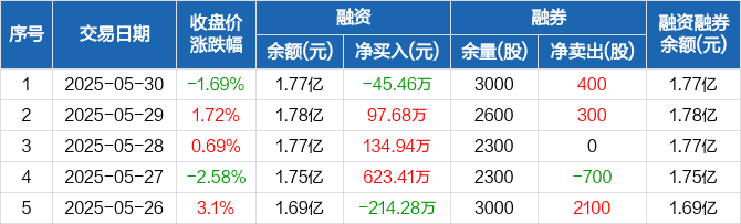 融资方面,当日融资买入872.78万元,融资偿还918.24万元,融资净偿还45.46万元。融券方面,融券卖出800股,融券偿还400股,融券余量3000股,融券余额14.35万元。融资融券余额合计1.77亿元。