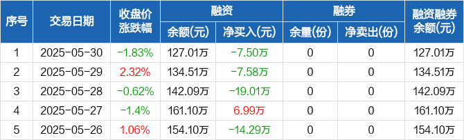 融资方面,当日融资买入1.75万元,融资偿还9.25万元,融资净偿还7.5万元,连续3日净偿还累计34.09万元。融券方面,融券卖出0份,融券偿还0份,融券余量0份,融券余额0元。融资融券余额合计127.01万元。