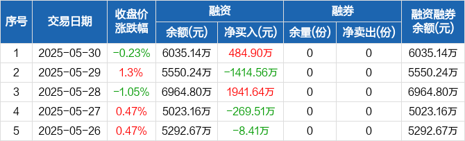 融资方面,当日融资买入869.35万元,融资偿还384.46万元,融资净买入484.9万元。融券方面,融券卖出0份,融券偿还0份,融券余量0份,融券余额0元。融资融券余额合计6035.14万元。