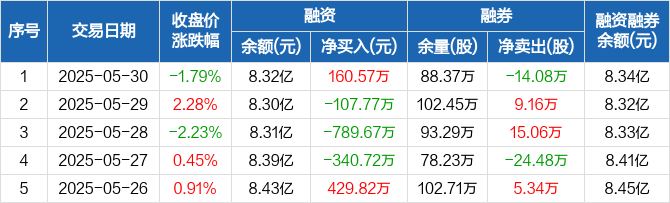融资方面,当日融资买入1091.77万元,融资偿还931.21万元,融资净买入160.57万元。融券方面,融券卖出4.14万股,融券偿还18.22万股,融券余量88.37万股,融券余额194.41万元。融资融券余额合计8.34亿元。