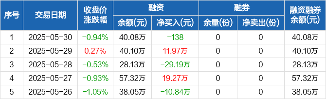 融资方面,当日融资买入49.9万元,融资偿还49.91万元,融资净偿还138元。融券方面,融券卖出0份,融券偿还0份,融券余量0份,融券余额0元。融资融券余额合计40.08万元。